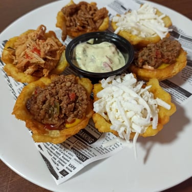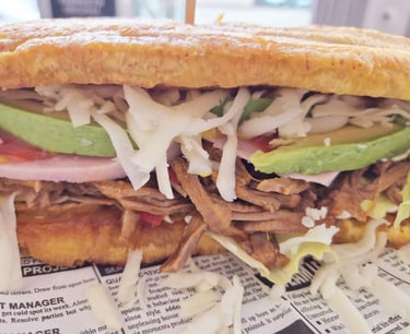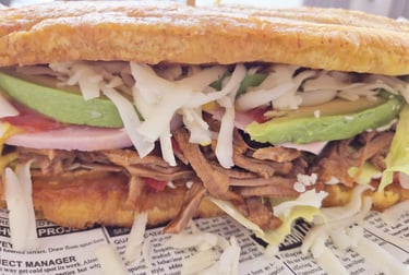 Carne de Res desmechada y sazonada, Jamón cocido Aguacate, Tomate, Ensalada, Queso, Salsas