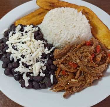 Carne de Res desmechada, Caraotas Negras, Queso, Plátano Maduro, Arroz, Huevo